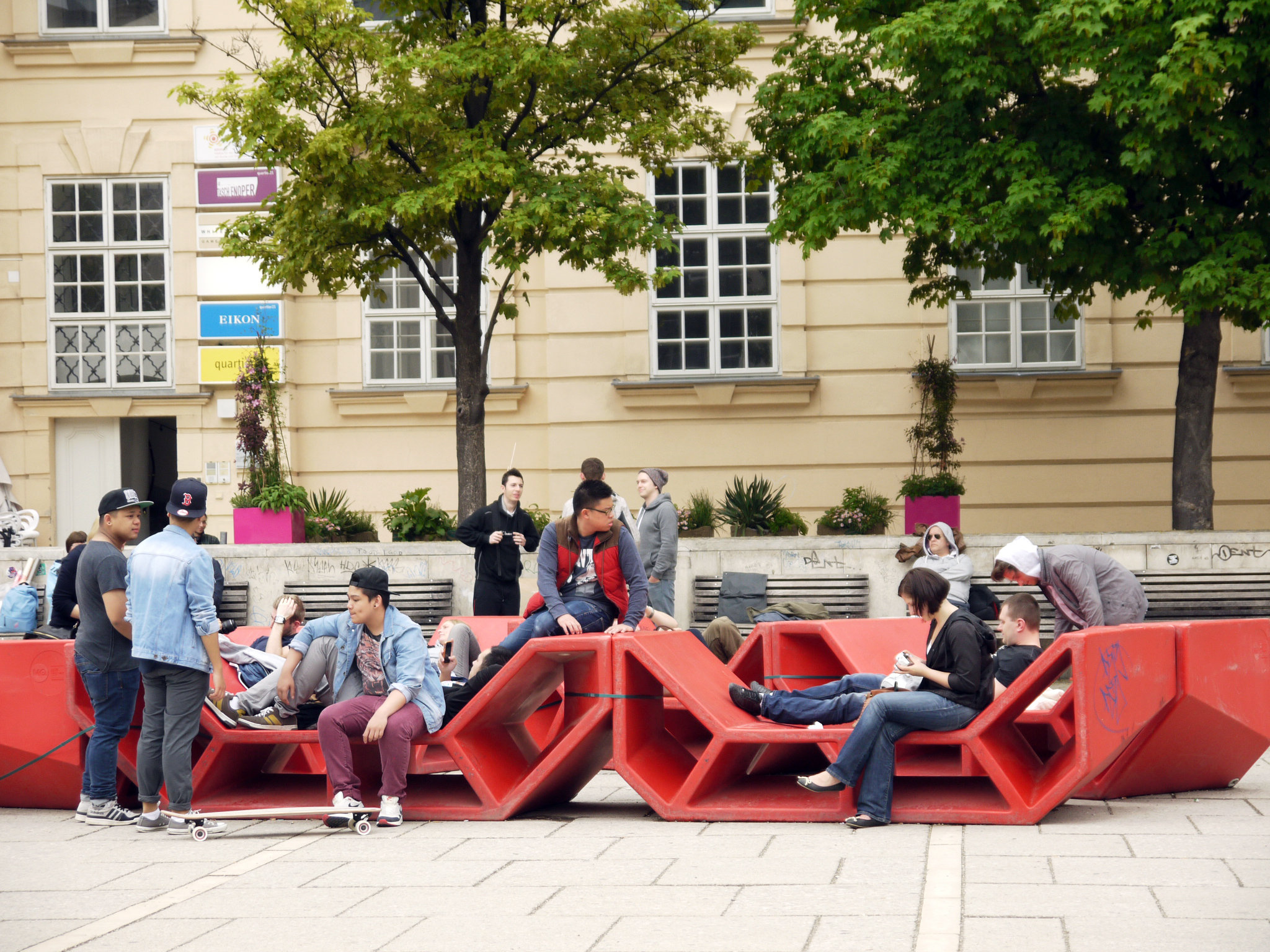 L’exemple qui m’a certainement le plus impressionné se situe en plein cœur du Quartier des Musées où une vaste place publique a été ingénieusement ponctuée de sièges de plastique aux formes géométriques variées. Du jaunes canari au rouge pompier, ces bancs se transforment tout au long de la journée en petits théâtres citoyens que j’ai bien dû observer avec fascination pendant près d’une heure. Les enfants s’y amusent comme des petits fous, alors que de jeunes étudiants y prennent un bain de soleil entre amis. On profite simplement de la vie, quoi !