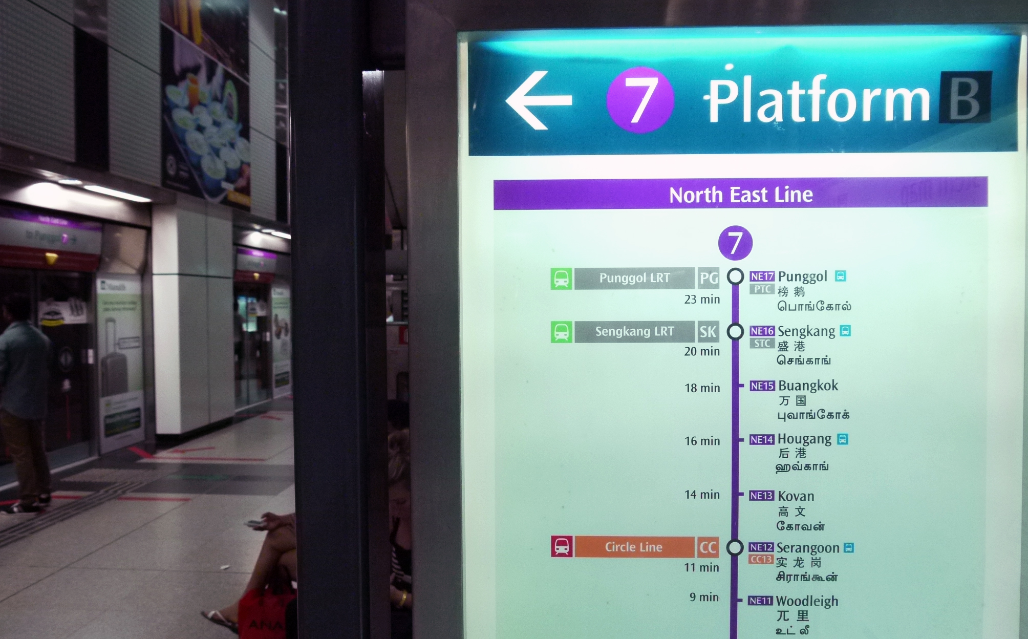 Sur chaque quai, on retrouve également des affiches indiquant non seulement les stations à venir, mais également la durée entre chaque arrêt. Une idée bien simple, mais pertinente pour aider les usagers à calculer le temps restant à leur trajet.