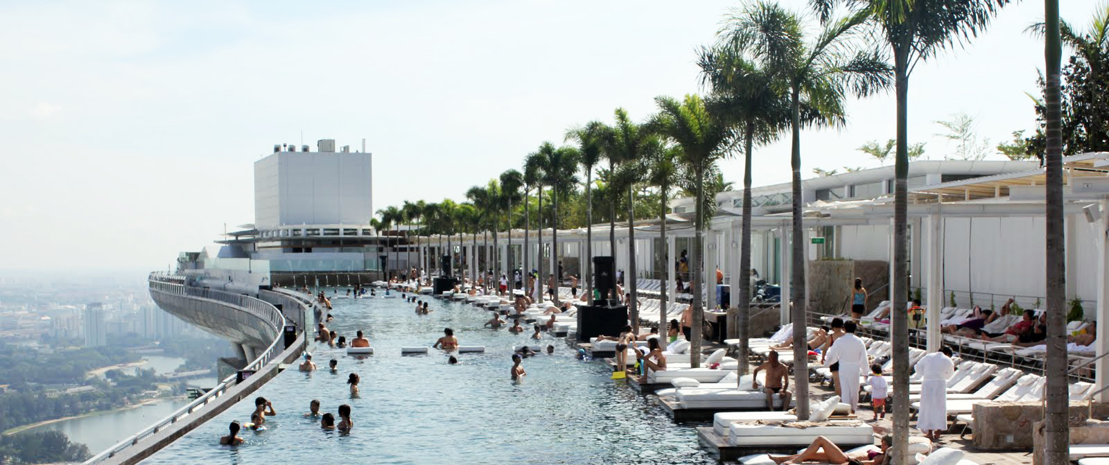 Conçu par l’architecte israélo-canadien Moshe Safdie (concepteur d’Habitat 67 à Montréal), le complexe est divisé en trois tours identiques de 55 étages, reliées au sommet par ce qui s’apparente à… un bateau de croisière ! Un « bateau » surnommé le SkyPark pouvant accueillir jusqu’à 3 900 personnes via une série de restaurants, de bars et une longue piscine offrant une incroyable vue sur la ville de Singapour.