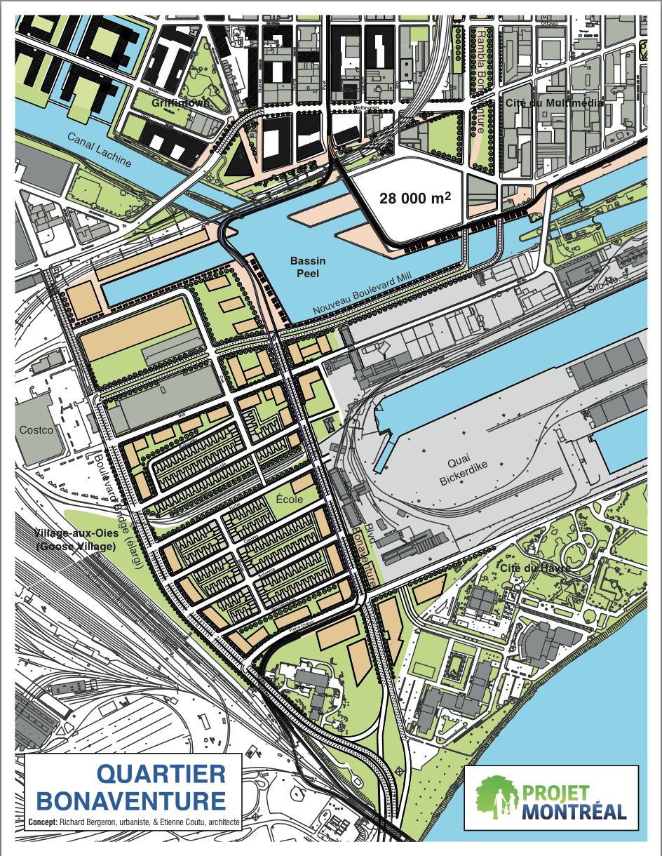 Situé en bordure du Bassin Peel, ce futur secteur résidentiel permettrait d’accueillir 7 000 ménages en ressuscitant le Goose Village (Village-aux-Oies), rasé de la trame montréalaise dans les années ’60 avec la construction de l’autoroute Bonaventure. Ironiquement, la proposition ci-présente suggère avant tout le démantèlement de cette autoroute (qui pourrait avoir complétement disparu du portrait à l’été 2016) pour reconstruire un quartier avec des boulevards urbains.